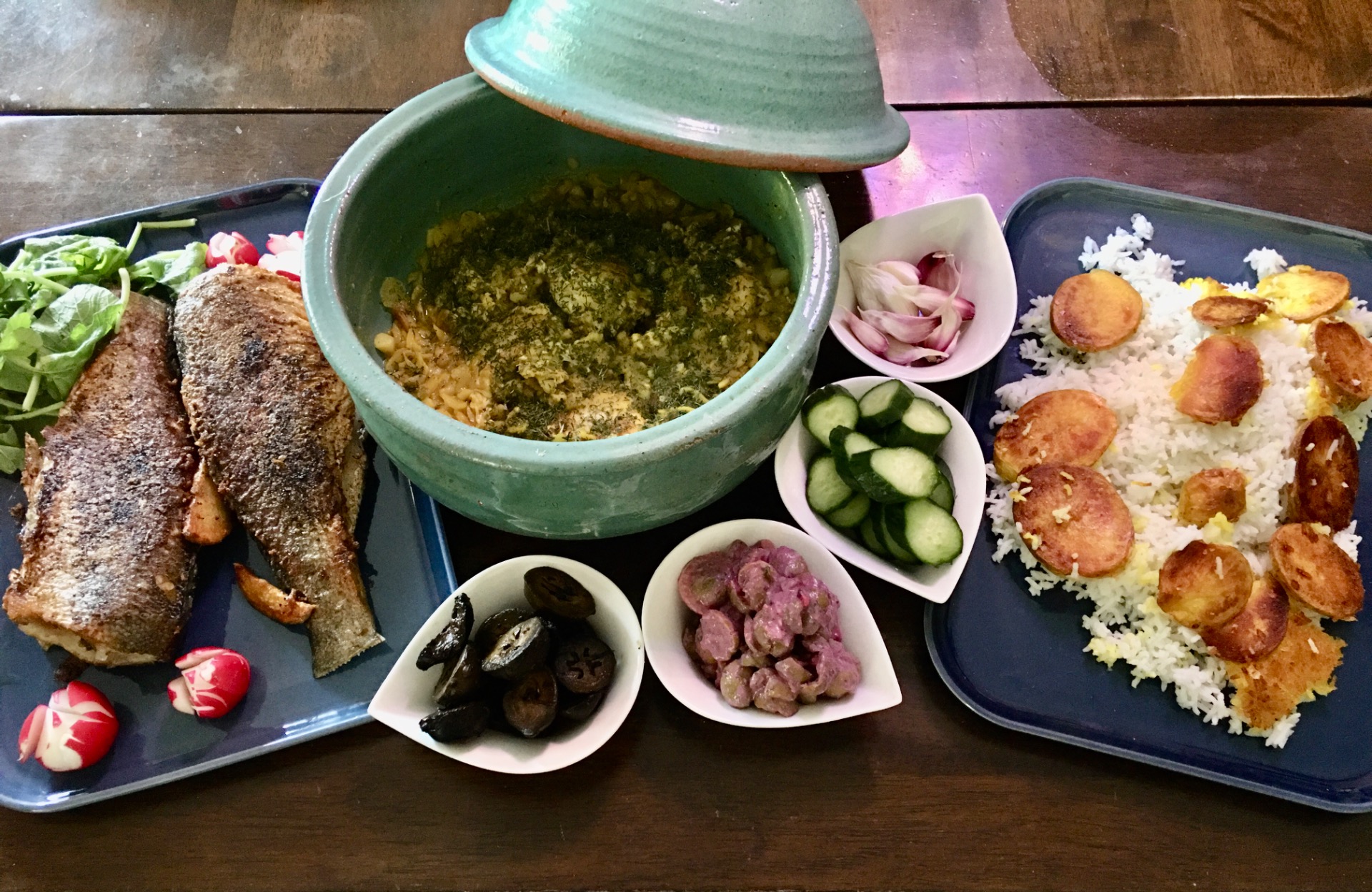 Grillade auberginer, tomatpuré, vitlök och ägg, serveras med tunnt persiskt surdegsbröd " nane sangak" , om ris önskas finns att betälla.