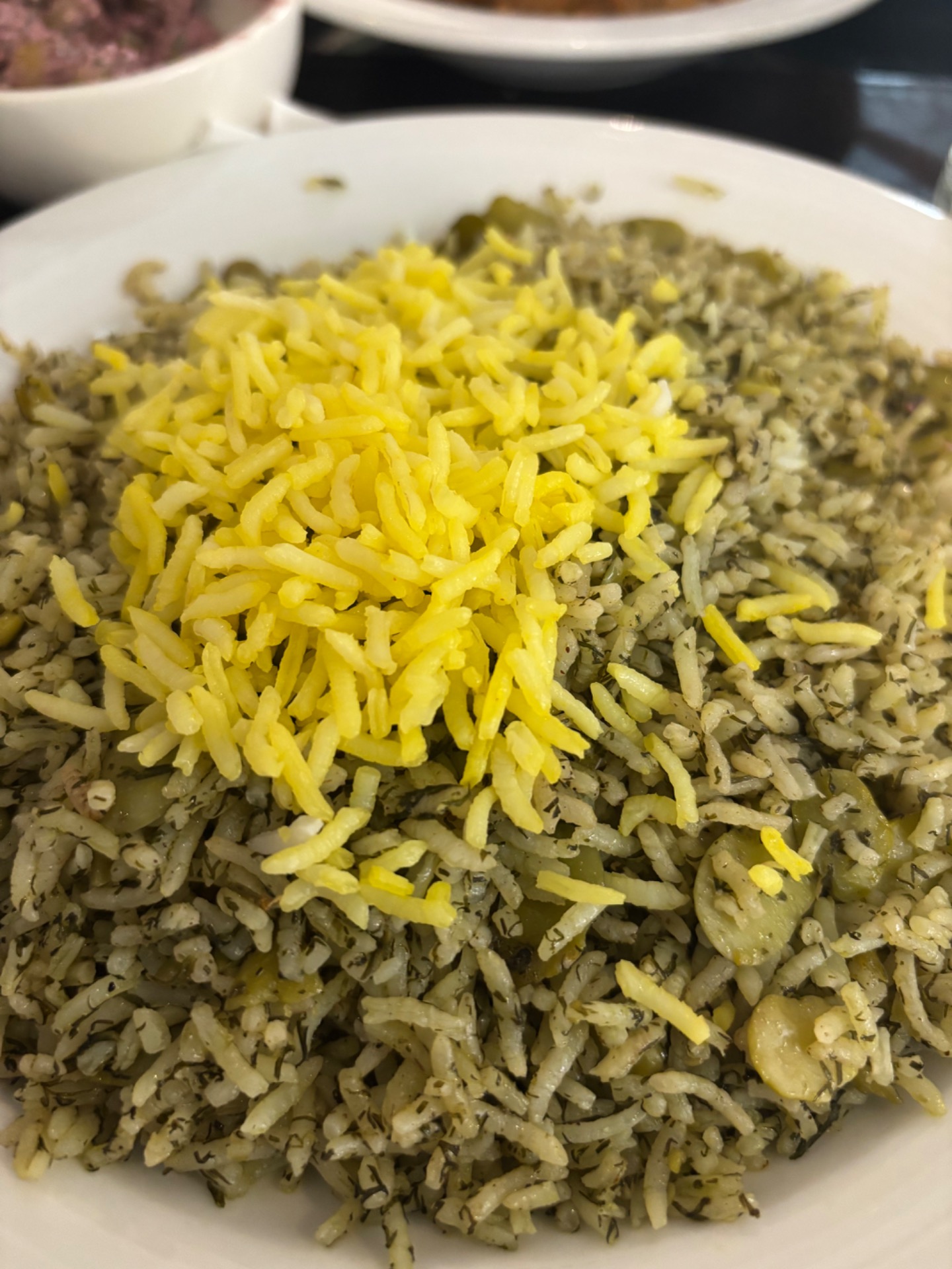 Gryta av skallade bönor, dill, ägg, vitlök, serveras med basmatiris