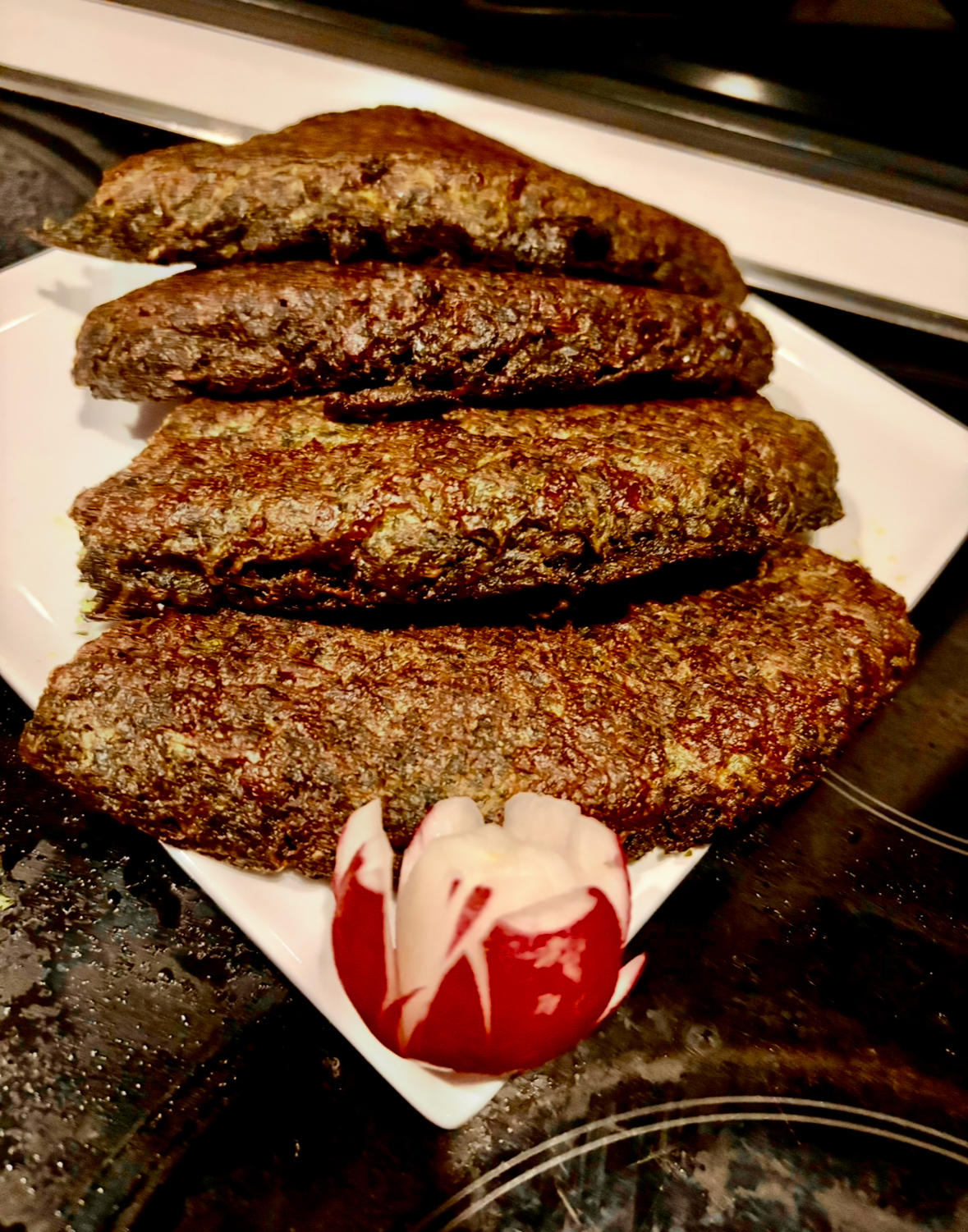 Grillade auberginer, tomatpuré, vitlök och ägg, serveras med tunnt persiskt surdegsbröd " nane sangak" , om ris önskas finns att beställa. (serveras även turkiskt Yoghurt).